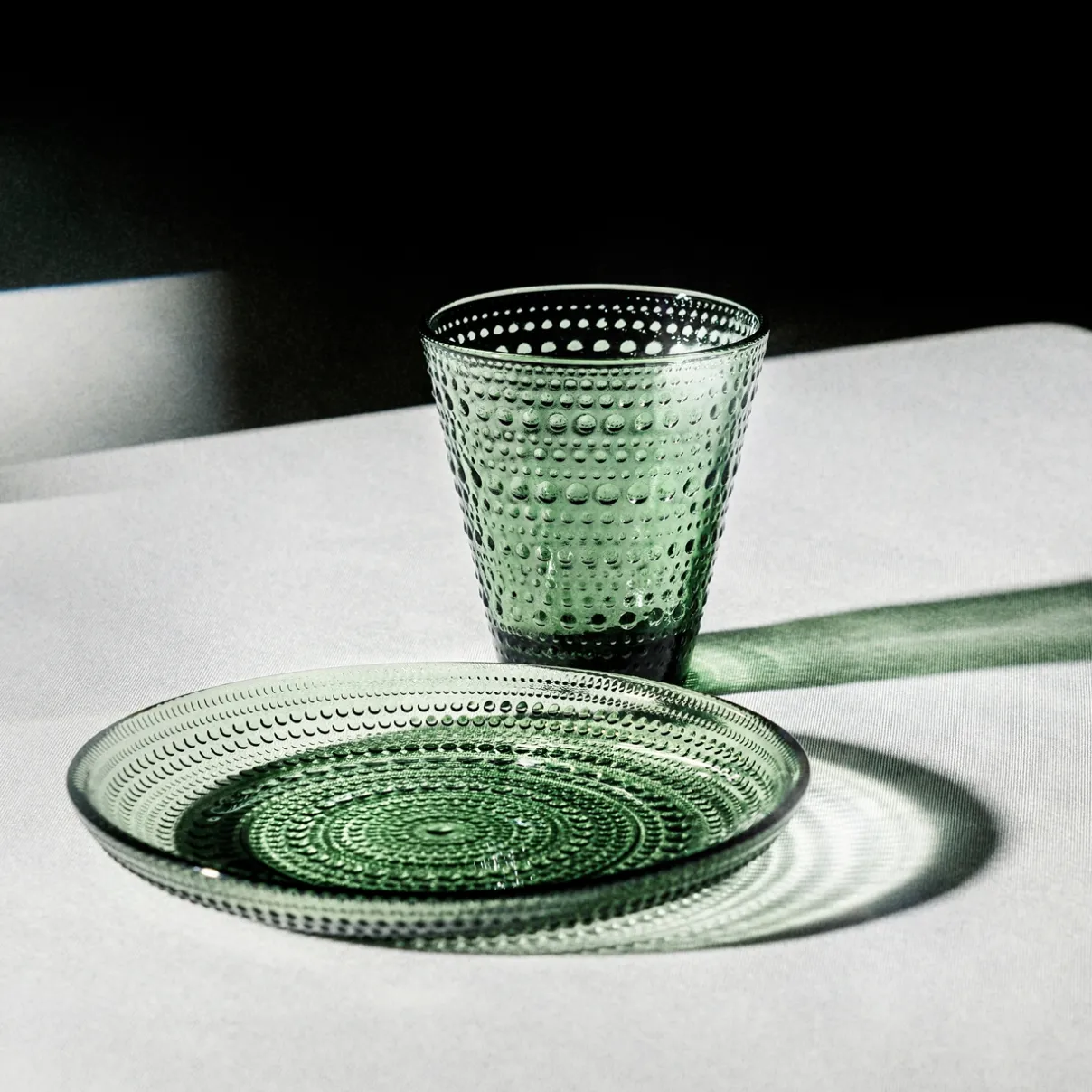 Oiva Toikan Kastehelmi-sarja tuo aamukasteen kauniit pisarat kattaukseen. Toikka sai suunnitteluun inspiraation yökasteen lehtiin jättämistä pienistä helmimäisistä kastepisaroista ja nyt Kastehelmi-lautanen hehkuu luonnon sävyissä uudessa havunvihreässä värissä. Yhdistelemällä Kastehelmen eri osia ja värejä luot kiinnostavan, ja omanlaisesi kattauksen. 170mm Kastehelmi-lautanen sopii täydellisesti tapaksille, alkupaloille ja jälkiruoille. Kastehelmi-sarjan tuotteet valmistetaan Iittalan lasitehtaalla Suomessa ja lautanen on konepesun kestävä.