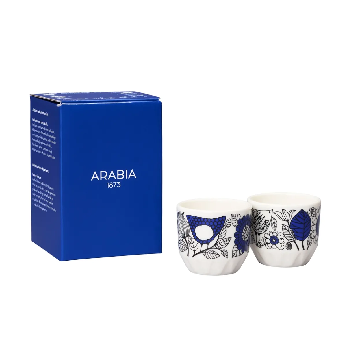 Pienet linnut ja kukat kiertävät Pastoraali-munakuppien ympärillä. Kuppien koko sopii myös pienille juomille, kuten aamujen vitamiinishoteille. Esteri Tomulan suunnittelema Pastoraali on yksi Arabian rakastetuimmista koristeista. Yhdistele Pastoraali-munakuppeja muihin Arabian astiastoihin. Jokainen pakkaus sisältää kaksi munakuppia.
