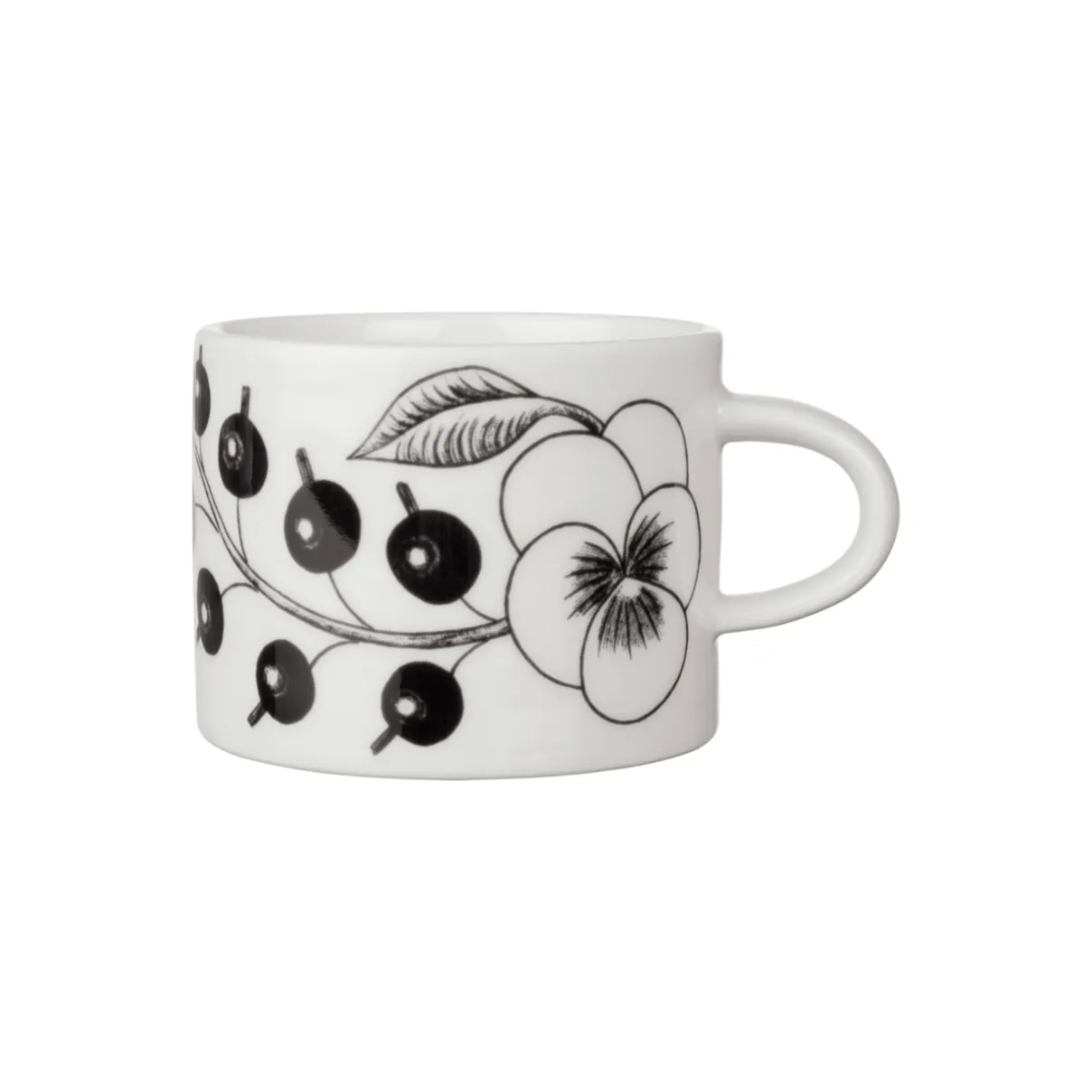 Pelkistetyt linjat ja runsas kukka- ja hedelmäaiheinen kuvio ovat tehneet Paratiisi-sarjasta yhden suomalaisten kattausten klassikoista ja mustavalkoisena kuvion graafisuus korostuu entisestään. Puhdaslinjainen 0,28L kuppi sopii teen, kahvin ja kaakaon tarjoiluun ja kupin alusvadiksi sopii 16,5cm lautanen.