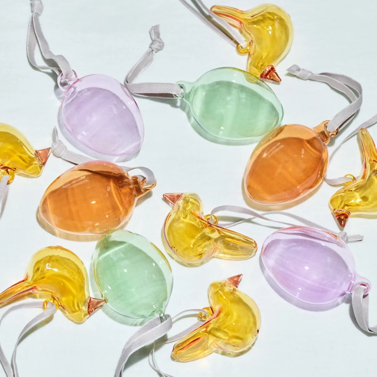 Kutsu kevät kotiisi pastellivärisillä koristemunilla. Harmaasta kangasnauhasta ripustettavien lasikoristeiden pehmeät persikan, laventelin ja ruohon sävyt heijastavat valoa kauniisti. Kolmen kappaleen paketteina myytävät lasimunat ihastuttavat kodin juhlapöydässä tai ovat mukava tuliainen pääsiäisvierailulla.